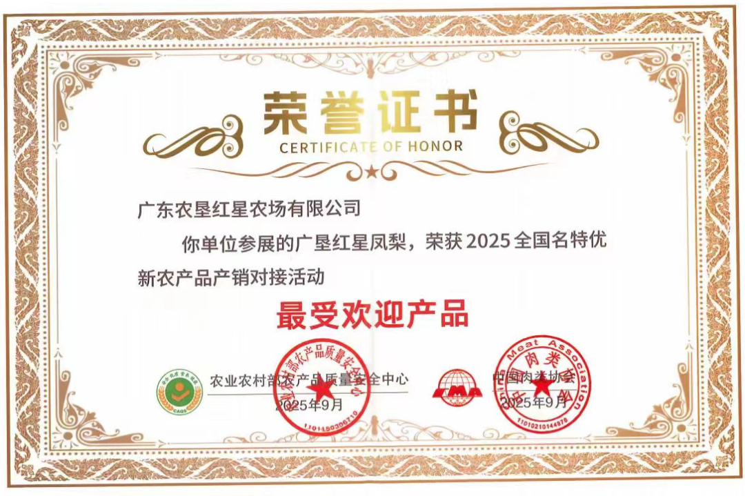 近日,农业农村部农产品质量安全中心、中国肉类协会公布2025年全国名特优新农产品产销对接活动最受欢迎产品名单,广东农垦红星农场有限公司“广垦红星凤梨”榜上有名。
